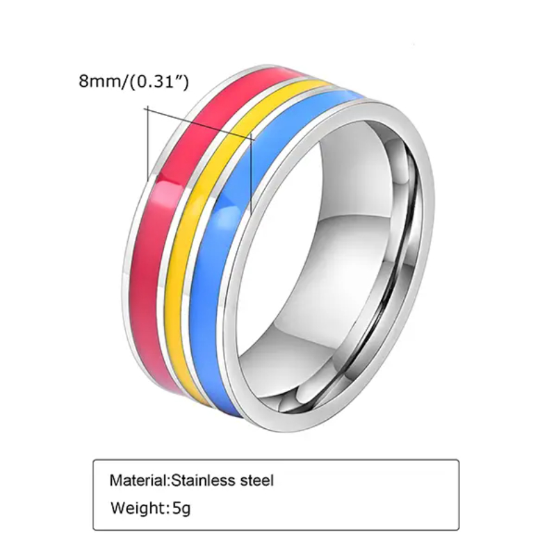 Enamel Stripe Band Style Pride Ring is a band-style accessory featuring a smooth metal base with an enamel stripe inlay. The design uses clean horizontal striping to create a bold look that pairs easily with everyday outfits and event looks. The glossy enamel detail adds contrast against the metal finish, giving the band a clear visual focus without requiring extra styling.
